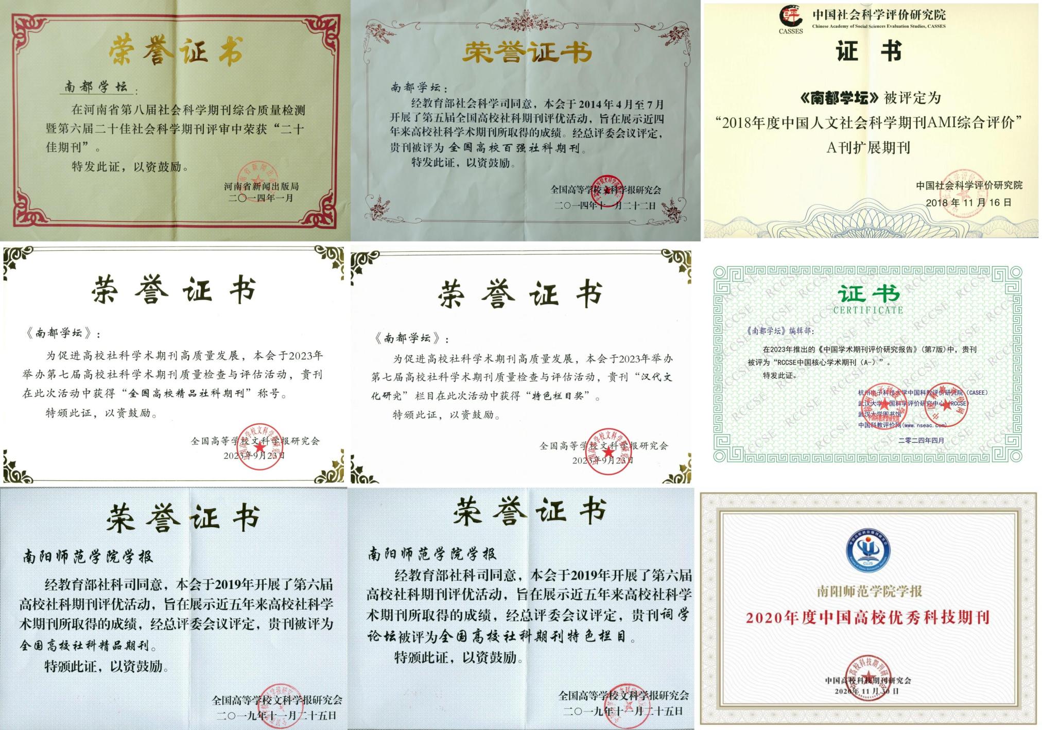 学校主办两种学术刊物《南都学坛》《太阳成tyc7111cc学报》,始终坚持正确的政治方向,遵守国家出版法律法规,坚持守正创新,学术至上,办刊质量不断得到提升。两刊均为全国精品社科期刊、全国百强社科期刊、河南省一级期刊。其中,《南都学坛》为河南省二十佳社科期刊、河南省十佳优秀社科期刊、RCCSE中国核心学术期刊;《太阳成tyc7111cc学报》自科版为中国高校特色科技期刊、中国高校优秀科技期刊;“汉代文化研究”和“词学论坛”栏目获“特色栏目奖”,为扩大学校影响和繁荣校内外学术交流做出了积极贡献。