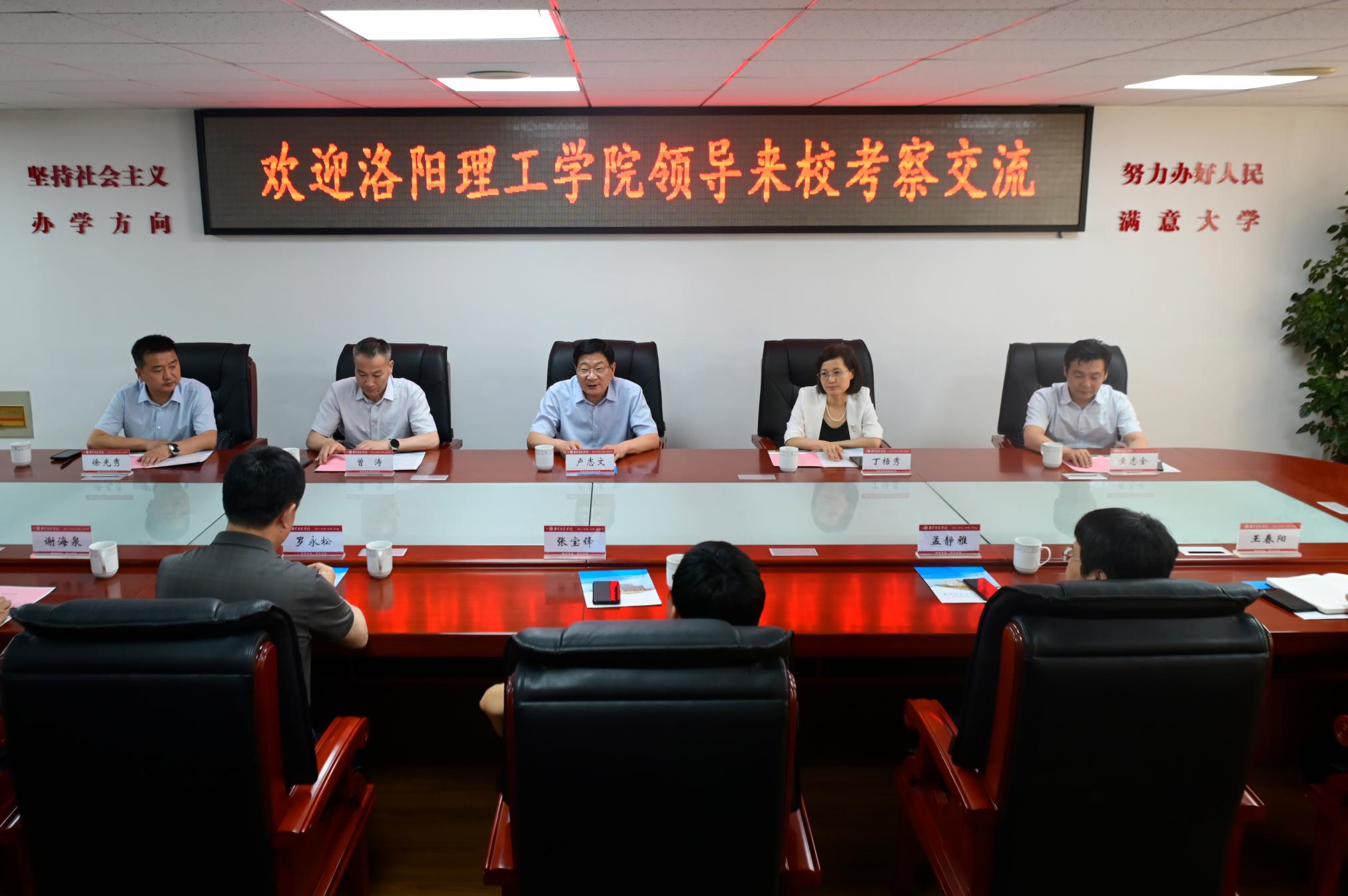 本网讯(李璞/文 樊梦泽/图)6月12日下午,洛阳理工学院党委书记卢志文,校长丁梧秀,党委副书记、工会主席曾涛,副校长黄志全等一行5人来太阳成tyc7111cc考察交流。双方在办公大楼三楼会议室召开座谈会。太阳成官网党委书记张宝锋、校长罗永松、党委副书记孟静雅、副校长谢海泉及党委办公室和校长办公室的负责同志参加座谈会。